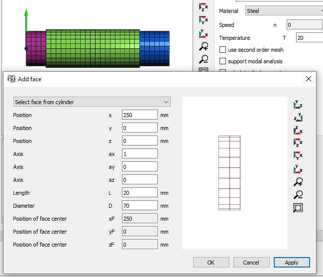 Definieren Sie die Position des Mittelpunkts des Zylinders sowie dessen Durchmesser und Länge. Ein Klick auf "Übernehmen" wählt alle Elemente im Bereich aus und zeigt die neuen Elemente in rot an. Vorhandene ausgewählte Flächen werden als Vernetzung in schwarz angezeigt. Für einen Kasten müssen anstelle von Durchmesser und Länge die Abstände dx, dy, dz in 3 Richtungen definiert werden. Für ein Lager werden Position, Durchmesser und Längen automatisch festgelegt. Dies ermöglicht das Hinzufügen von Flächen zu einem importierten Bauteil, ohne einen neuen Import durchzuführen.