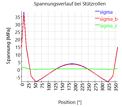 Die Biegespannung und die Spannung infolge von Zug/Druck sind im Diagramm dargestellt. Die Biegespannung wird für einen kritischen Punkt berechnet, der entweder manuell oder automatisch von der Software definiert wird. Diese Spannungen werden zur Berechnung eines statischen und dynamischen Sicherheitsfaktors für den Außenring verwendet.